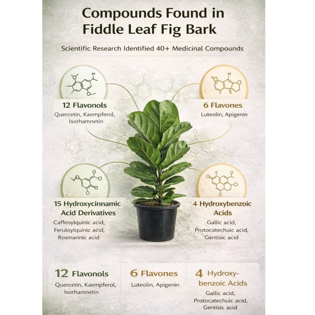 The research used bark from mature fiddle leaf fig trees – the kind that grow 40+ feet tall in their native West Africa with thick, woody trunks. Your 3-foot houseplant has the exact same genetic blueprint, but the concentrations are very different: