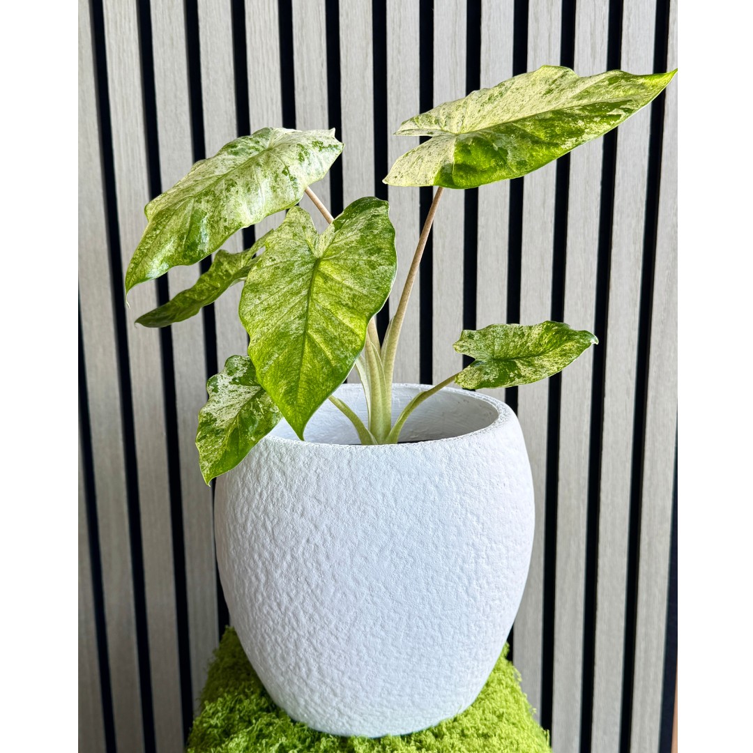 A rare, compact Alocasia with mesmerizing batik-like variegation. Every leaf is uniquely patterned with white, cream, mint and white.