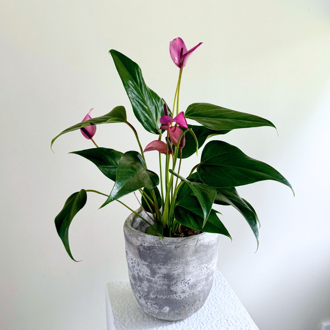 Always popular due to it’s modern leaf shape and ability to flower all year round with some love and attention. Anthuriums like a warm spot with bright indirect light. Water weekly and allow to dry out between waterings.
