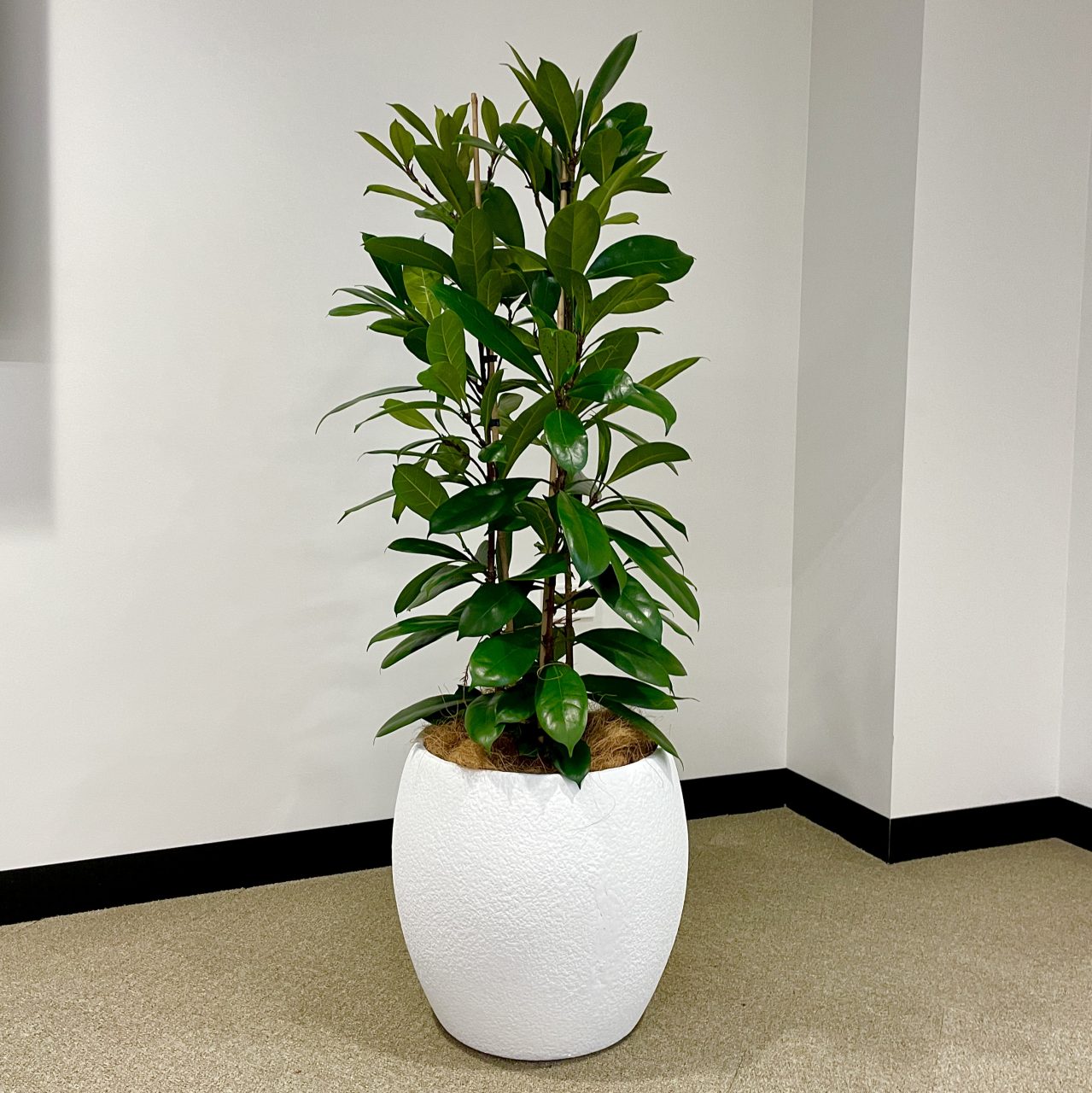 Ficus cyathistipula ‘Louis’ is a low-maintenance indoor plant with a tree-like appearance—perfect for bringing natural height and structure to your space. Available in two sizes, with the large grade offered in stylish white pots as shown.