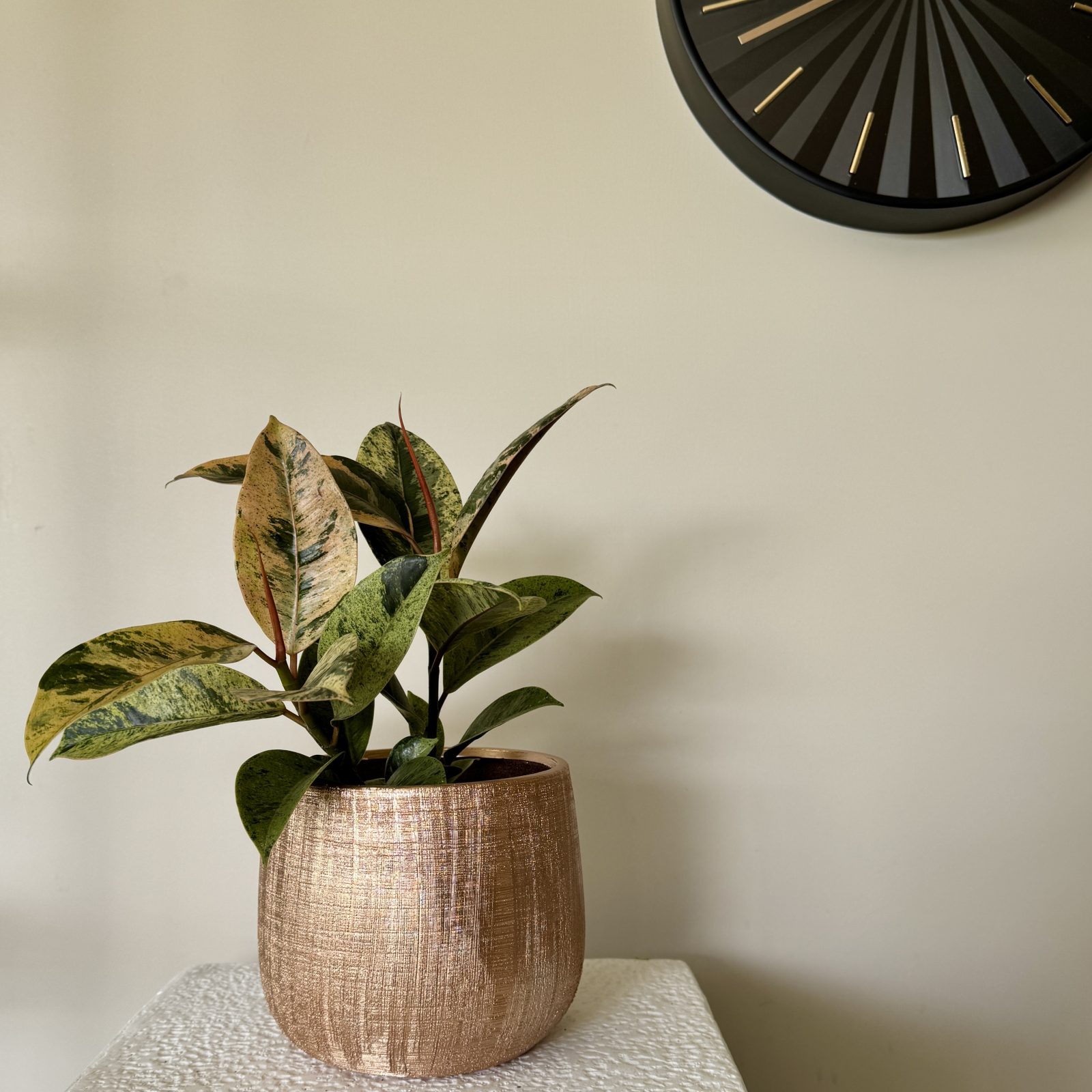 Bring rare foliage into your home with the Ficus Shivereana, a collector’s favourite known for its striking cream, pink, and green marbled leaves. Each plant has been double planted to create a fuller, bushier effect, making it an instant statement piece.