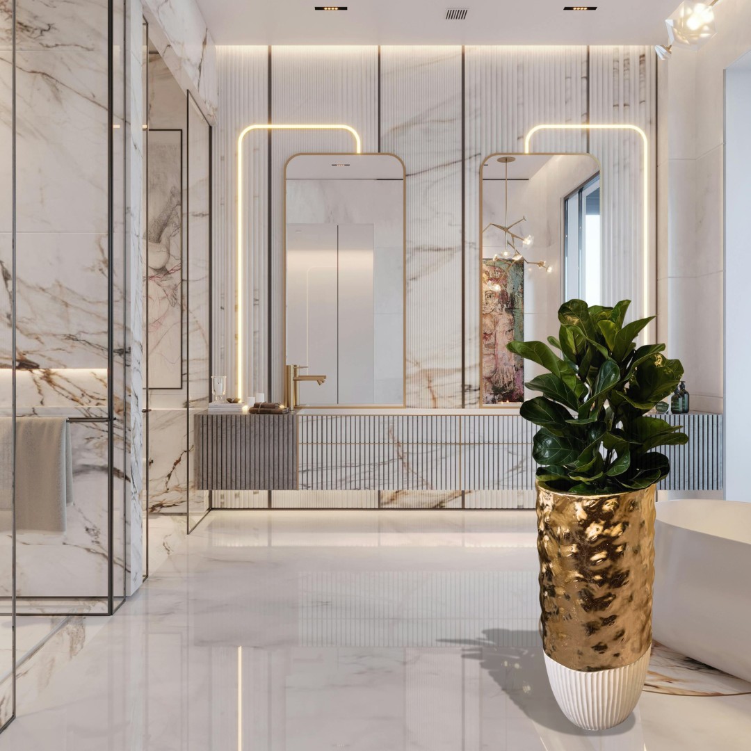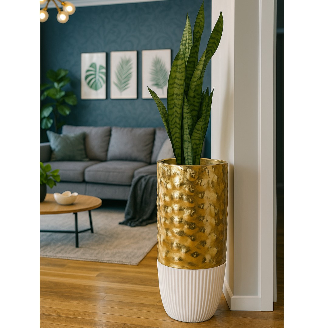 Functional Elegance: The Gold & White Venus Planter’s tall and slim profile is ideal for filling narrow spaces or for use as a decorative accent in corners, beside furniture, or in entryways.