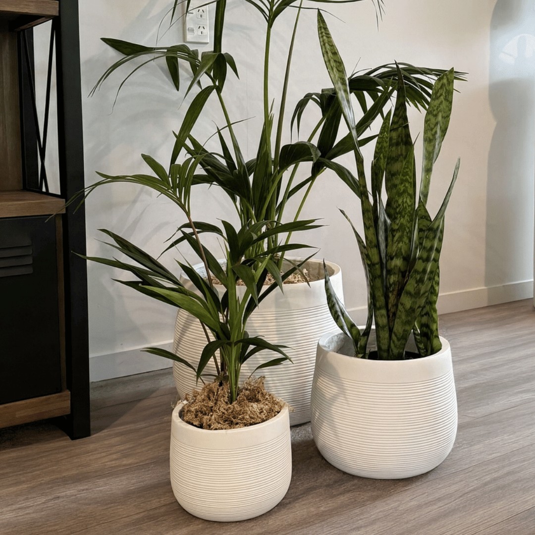 - Pot Design: The Kentia Palm is paired with our Magellanic White Planter, a sleek and lightweight planter with a cylindrical form and a rounded bottom. The pot features a lovely ribbed finish, adding texture and modern appeal to the overall look.